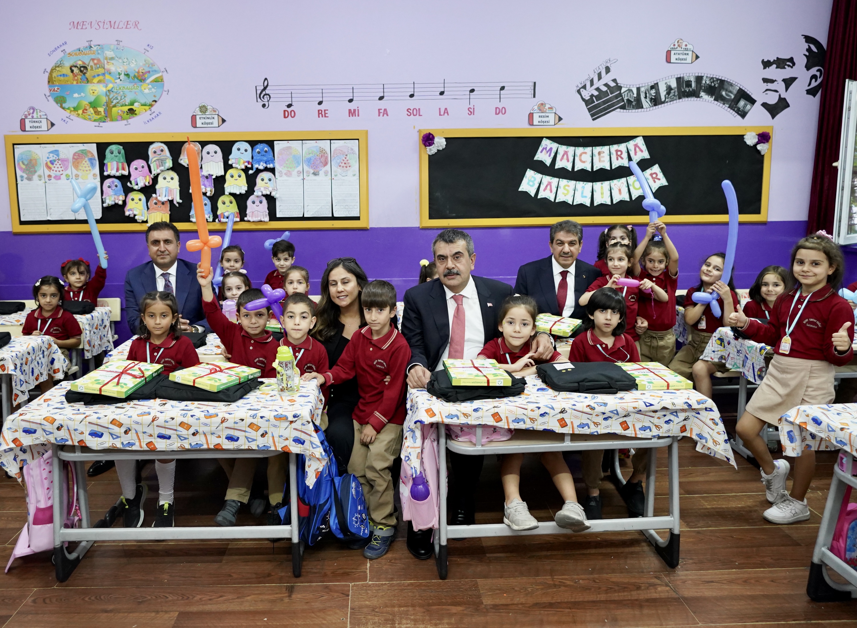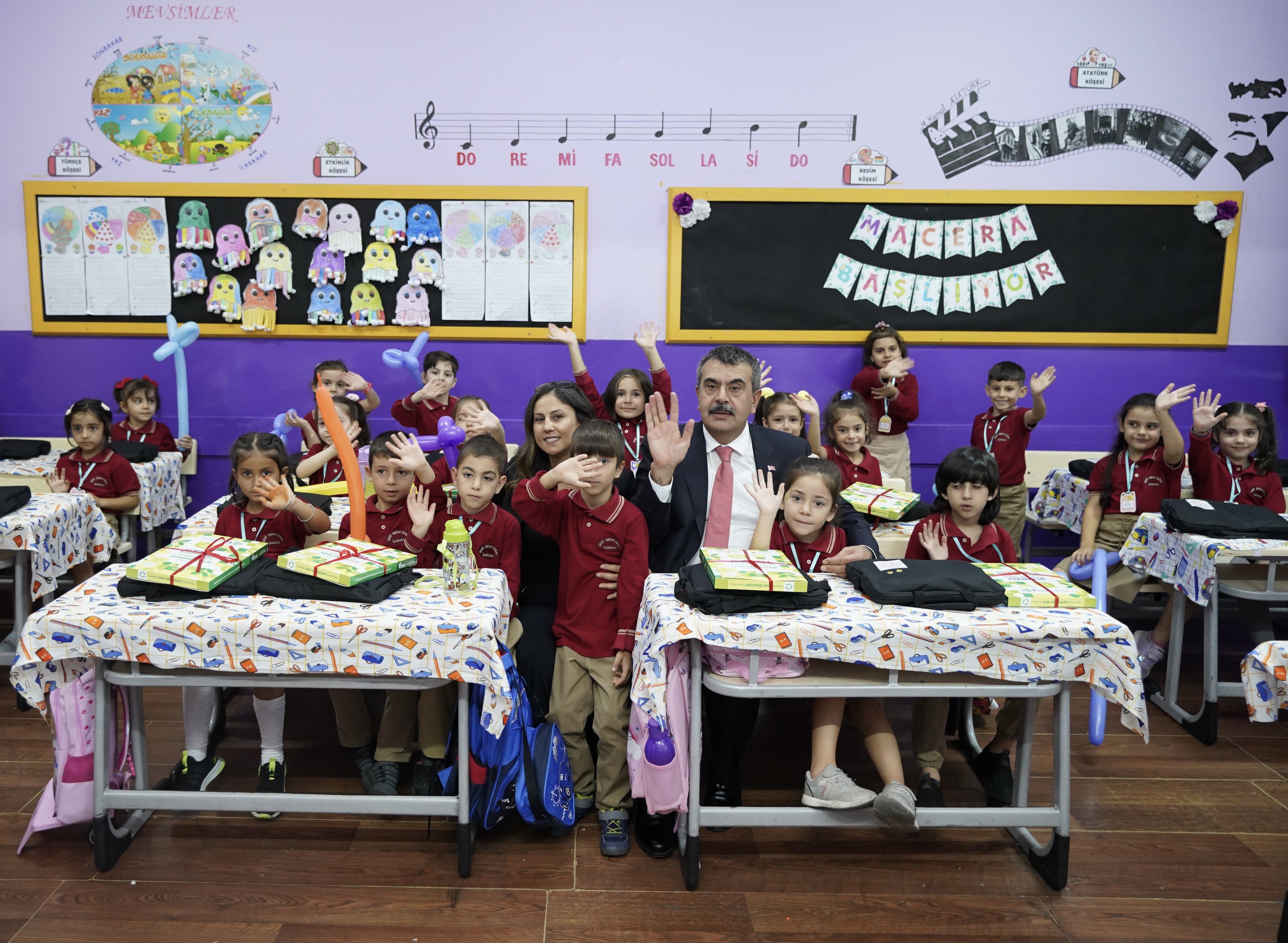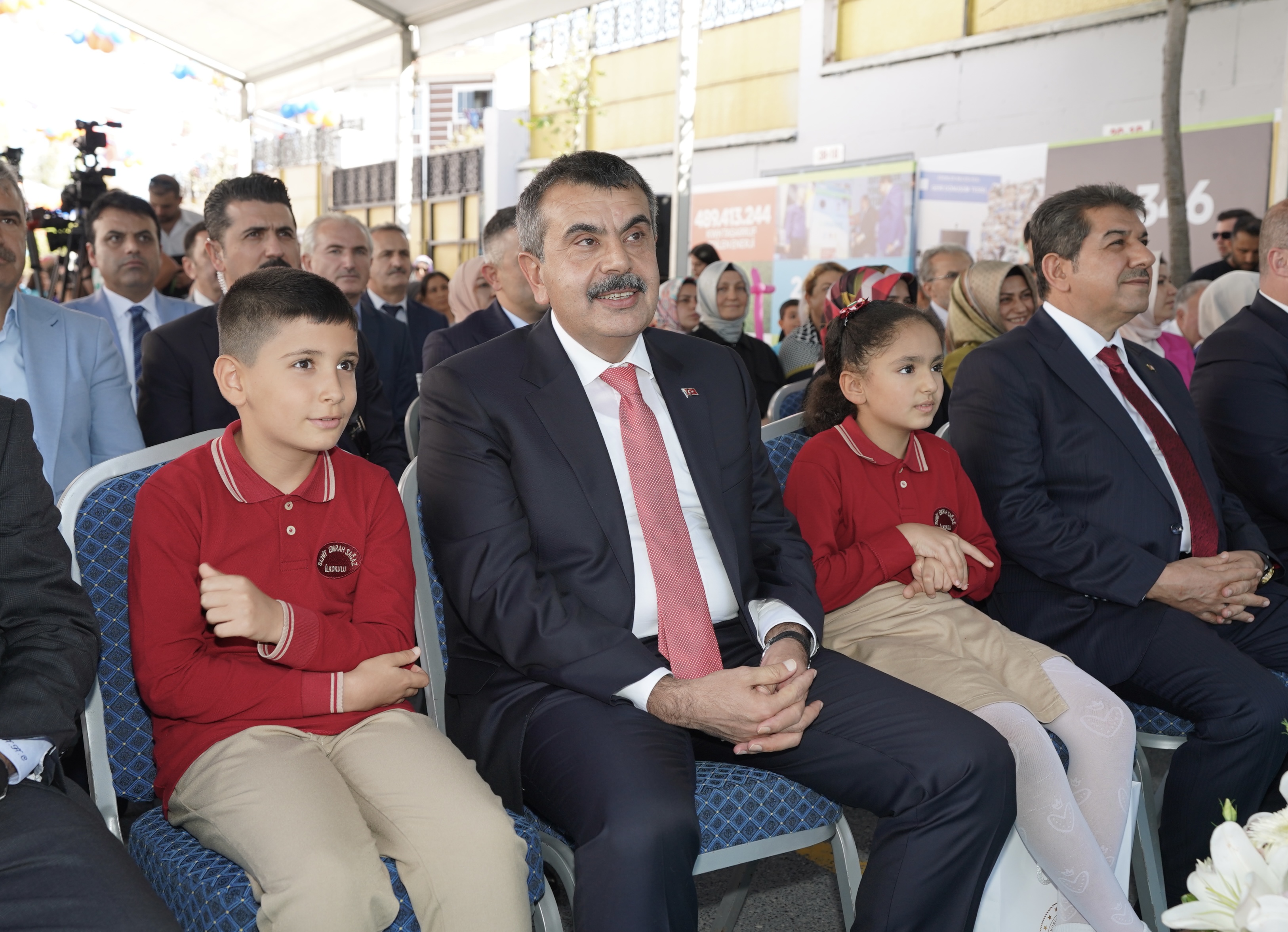 Bakan Yusuf Tekin, törenin ardından Şehit Emrah Sağaz İlkokulunda sınıfları ziyaret ederek öğrencilere defter dağıttı.