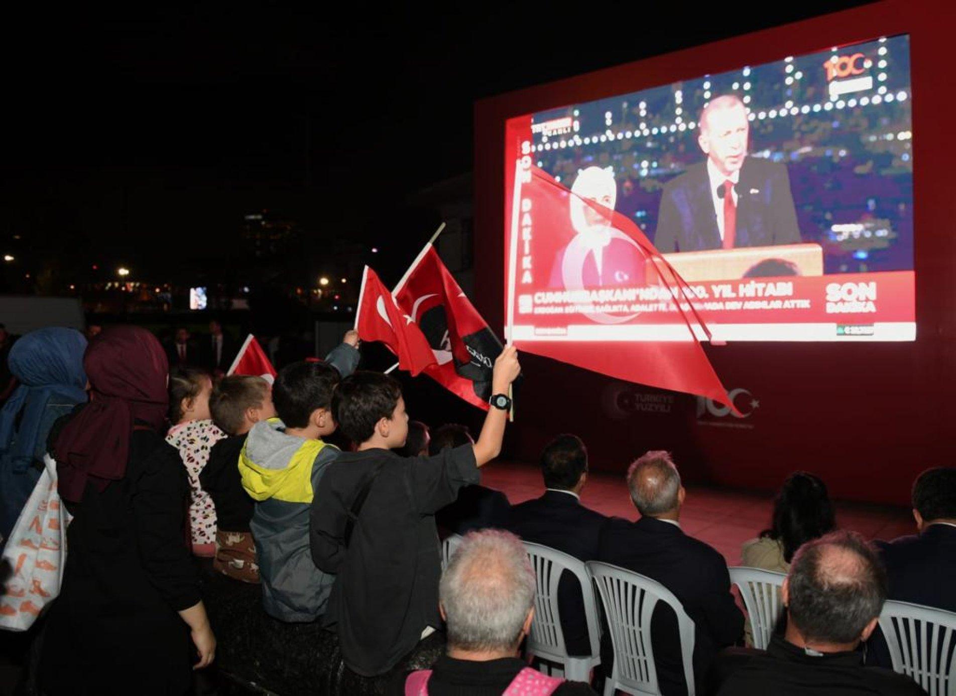 Etkinliği izleyenlerle hatıra fotoğrafı çektiren iki bakan, Cumhurbaşkanı Recep Tayyip Erdoğan’ın Vahdettin Köşkü’nde Cumhuriyet’in ilanının 100. yılı dolayısıyla yaptığı konuşmayı dinledi.