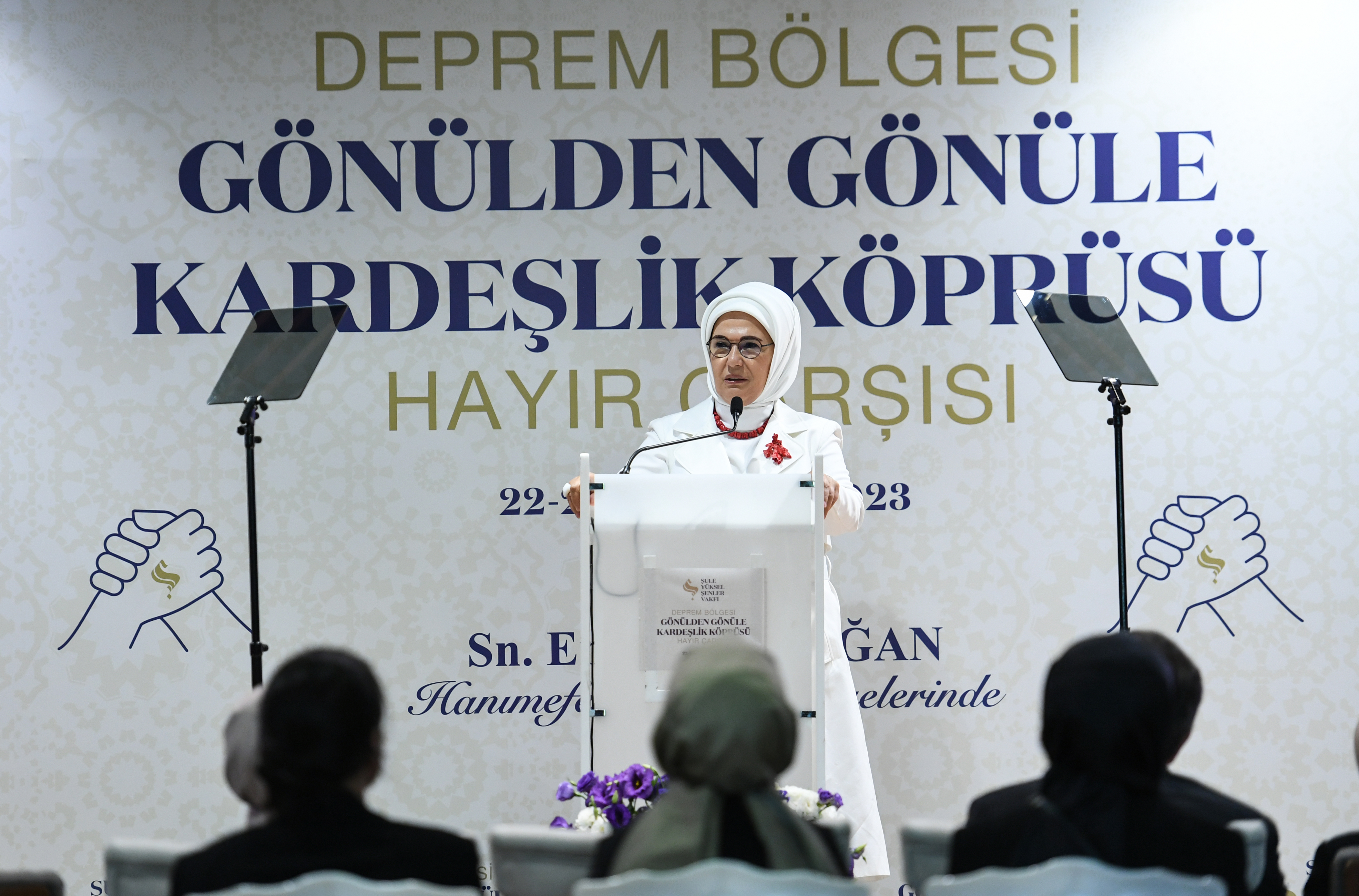 Emine Erdoğan, asrın felaketinin bir anda asrın dayanışma hareketine dönüştüğüne dikkati çekerek “Kökleşmiş ve âdeta milletimizin karakteri hâlini almış hayırseverlik geleneğimizin tezahürü oldu. Milyonlarca hayırsever, şehirlerimiz harabeye dönerken gönül mabetleri yıkılmasın diye tek yürek oldu.” dedi.