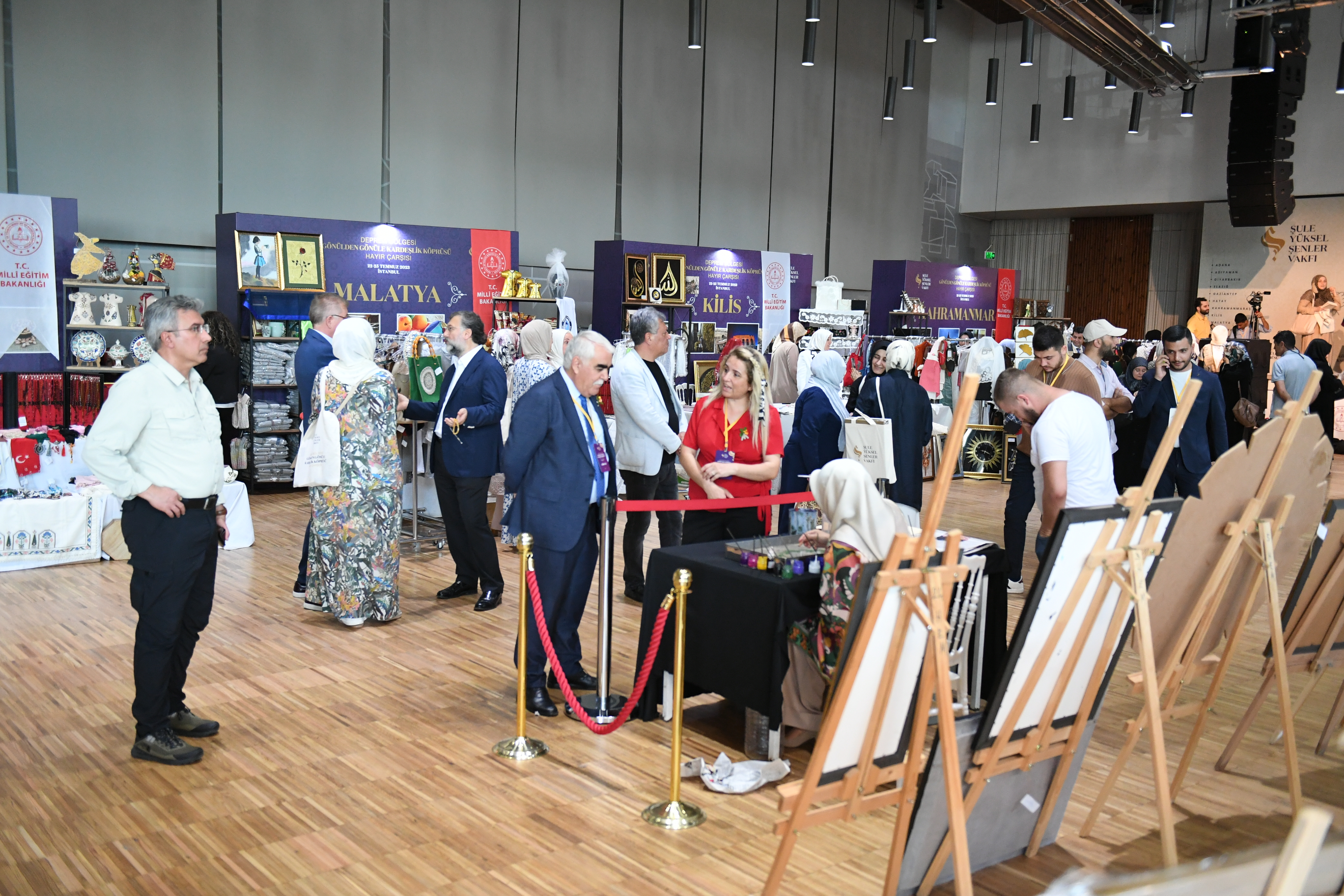 Konuşmaların ardından depremzedeler tarafından üretilen ürünlerle ilgili Millî Eğitim Bakanlığı yetkililerinden bilgi alan Emine Erdoğan, burada ürünleri yapan depremzedelerle bir süre sohbet etti. Emine Erdoğan, 11 il adına açılan ve vazolar, el işi dikiş nakış ürünleri, antika eşya, yağlı boya tablolar, tekstil ürünleri ve hediyelik eşyanın bulunduğu sergide satın aldığı ürünleri, yine depremzedeler yararına AFAD’a bağışladı.
