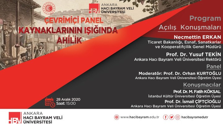 Ticaret Bakanlığı ile Ankara Hacı Bayram Veli Üniversitesi iş birliğiyle “Kaynaklarının Işığında Ahilik” konulu çevrimiçi panel düzenlendi. Panele Rektör Prof. Dr. Yusuf TEKİN ve Ticaret Bakanlığı Esnaf, Sanatkarlar ve Kooperatifçilik Genel Müdürü Necmettin ERKAN katılarak birer açılış konuşması yaptılar.