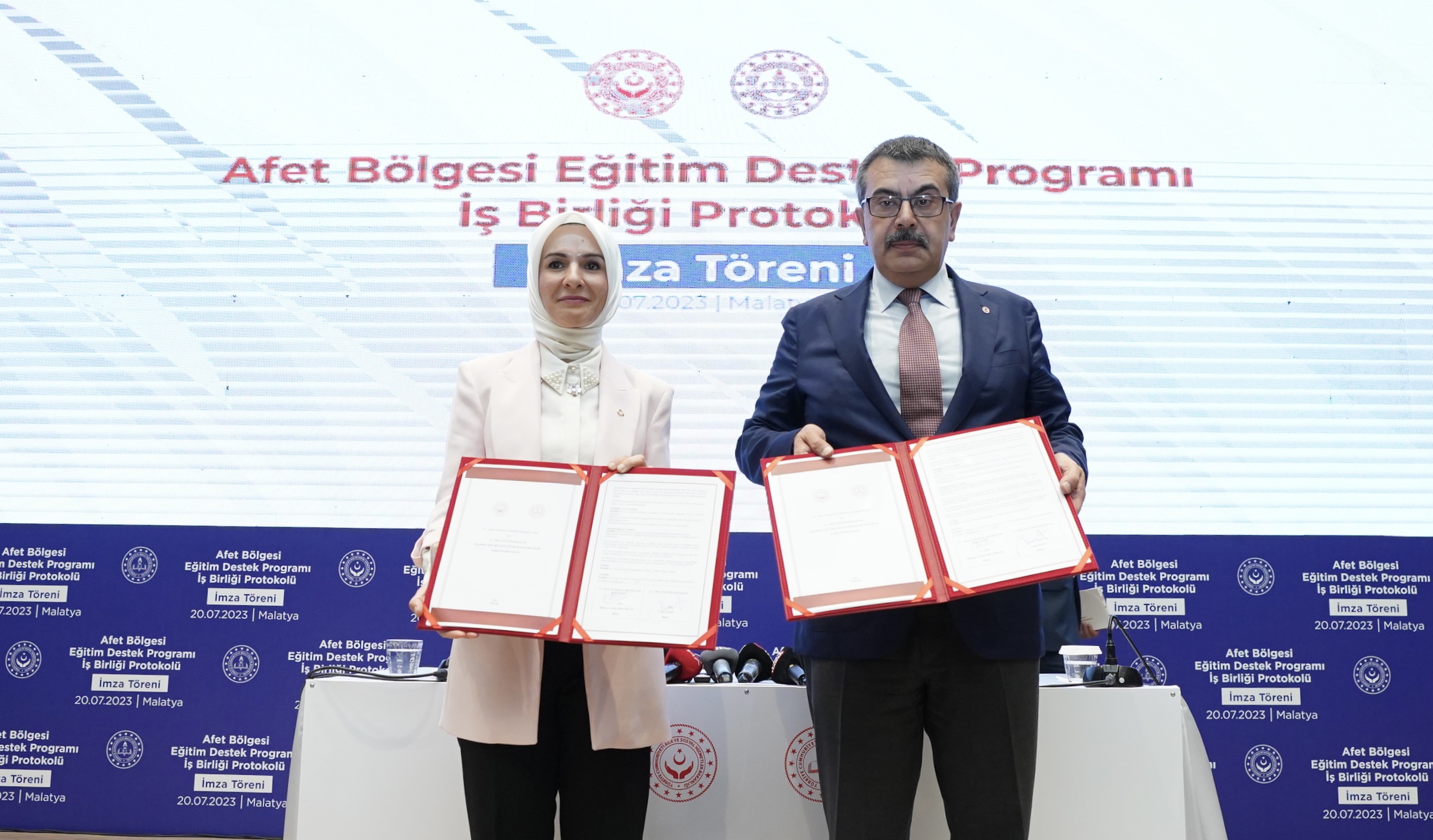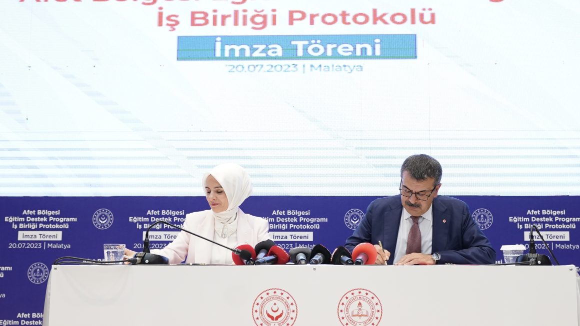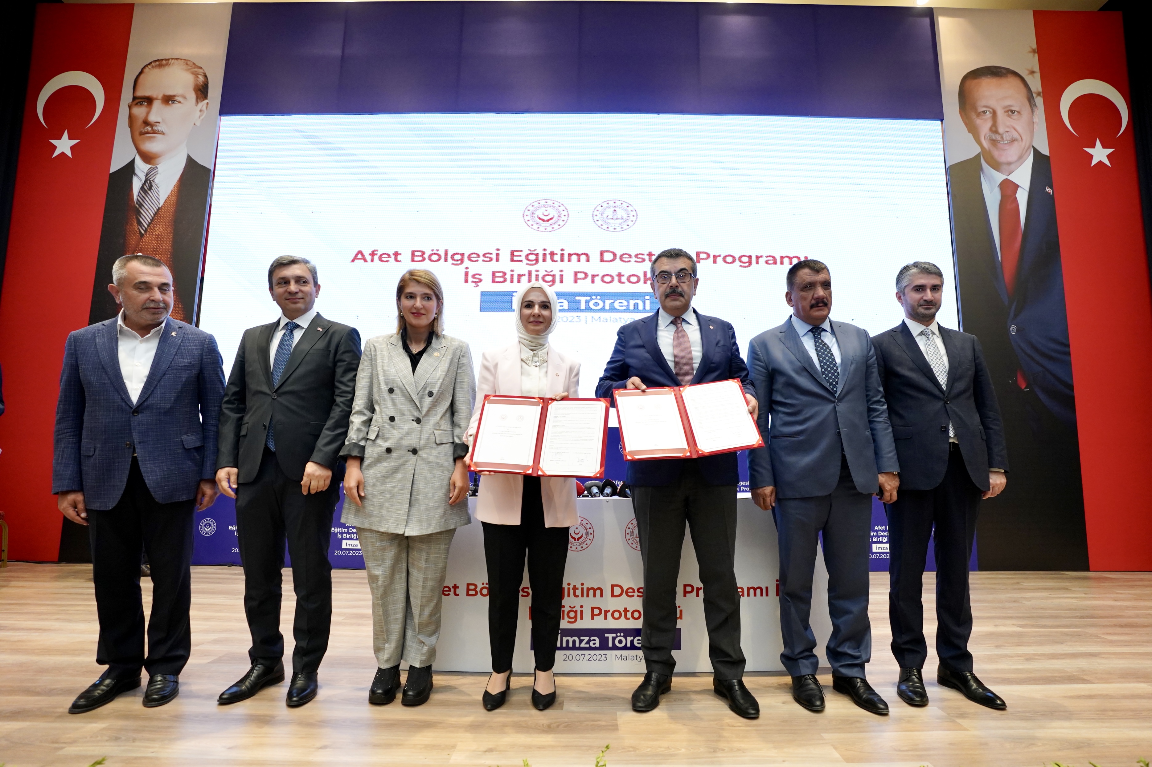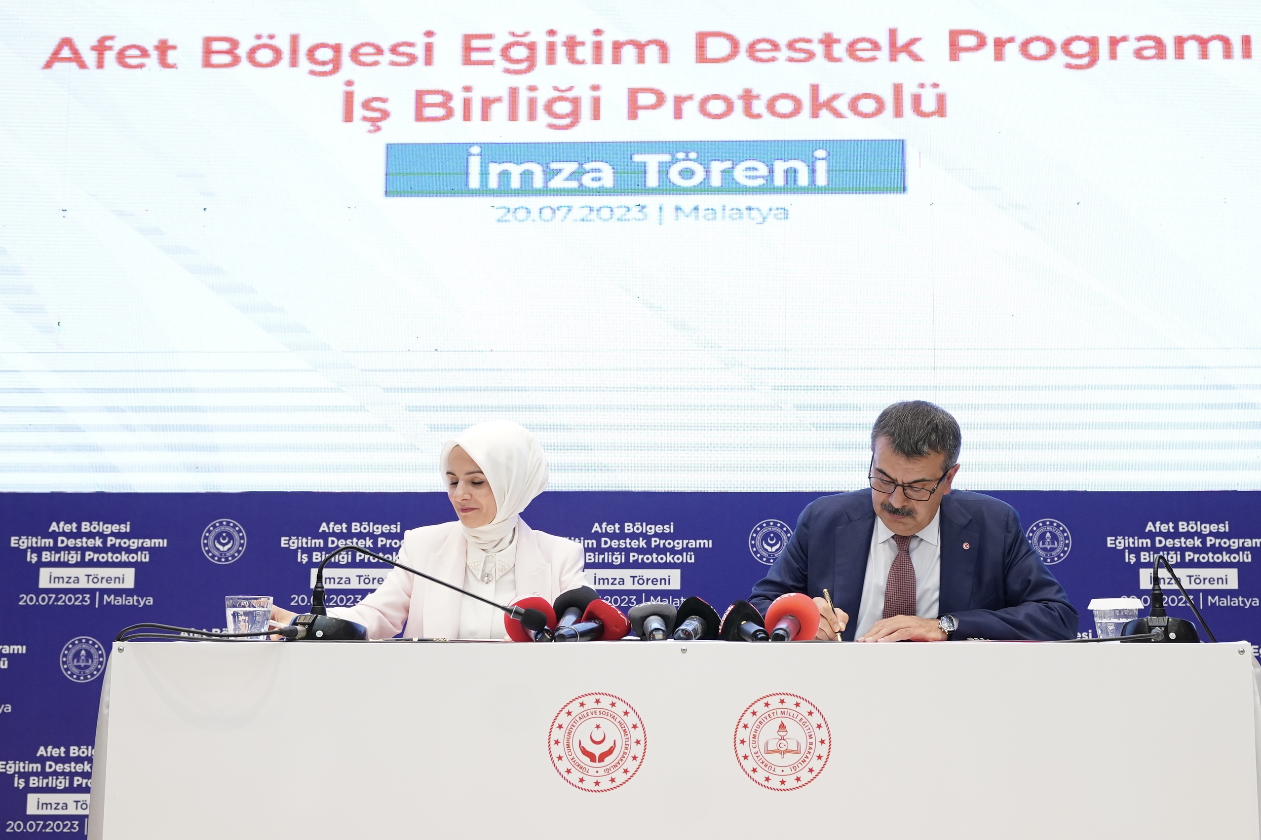 “Afet Bölgesi Eğitim Destek Programı İşbirliği Protokolü”, Millî Eğitim Bakanı Yusuf Tekin ile Aile ve Sosyal Hizmetler Bakanı Mahinur Özdemir Göktaş’ın katılımıyla Malatya’da imzalandı.