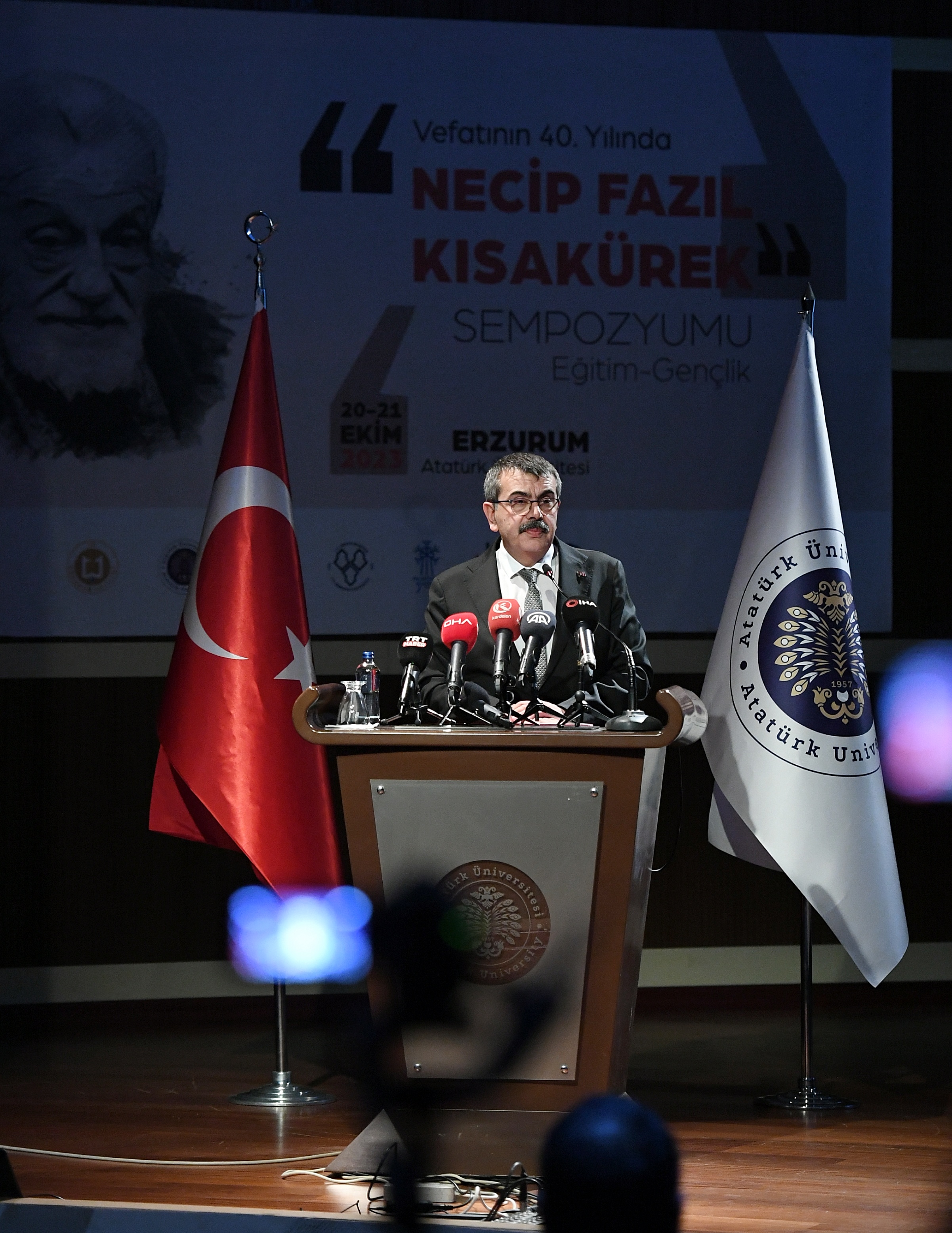 Millî Eğitim Bakanı Yusuf Tekin, Erzurum’daki Atatürk Üniversitesi Nene Hatun Kültür Merkezi’nde Cihannüma Dayanışma ve İş Birliği Derneğince düzenlenen “Eğitim ve Gençlik” temalı, “Vefatının 40. Yılında Necip Fazıl Kısakürek Sempozyumu” na katıldı.