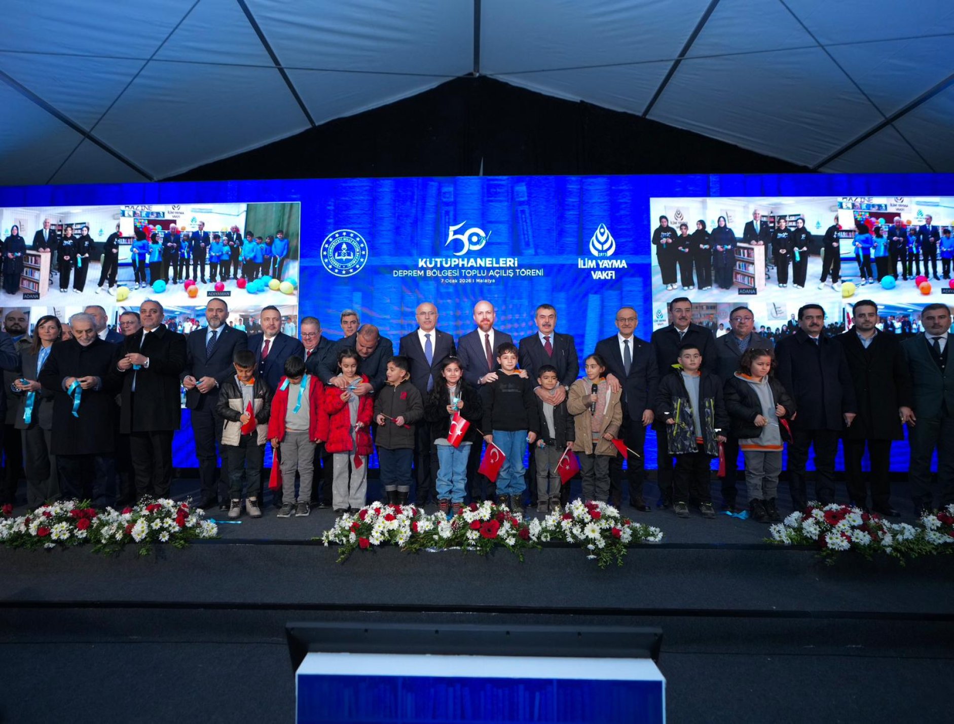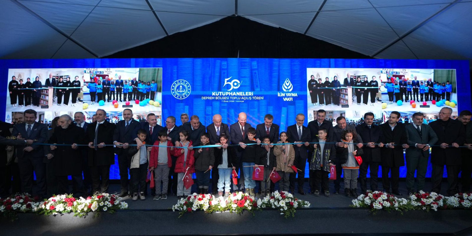 Konuşmaların ardından deprem bölgesindeki illere çevrim içi bağlanılarak yapılan 50. yıl kütüphanelerinin açılış kurdelesi kesildi.