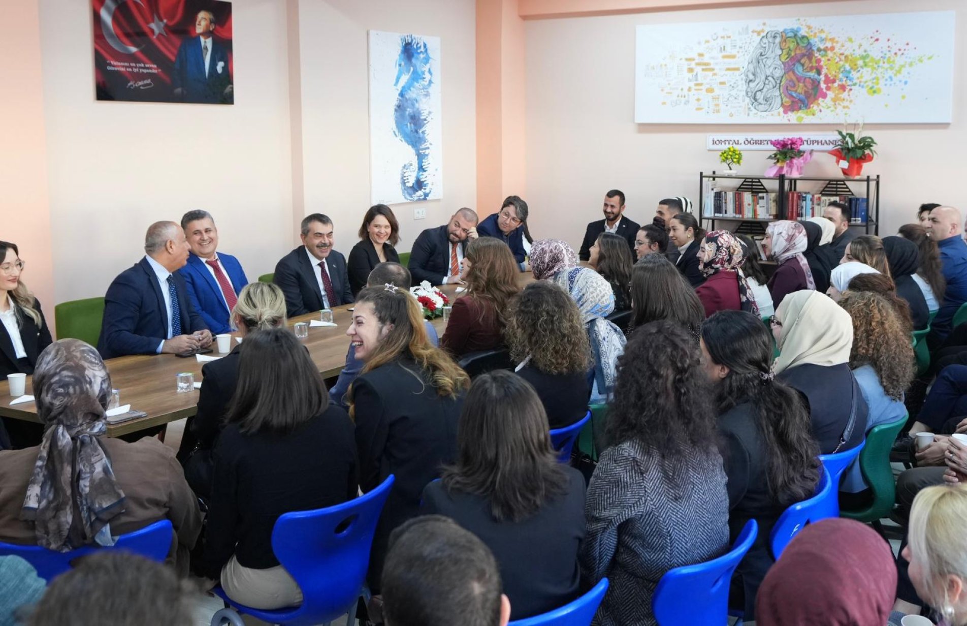 Öğrencilerle hatıra fotoğrafı çektiren Tekin, daha sonra öğretmenlerle bir araya geldi.