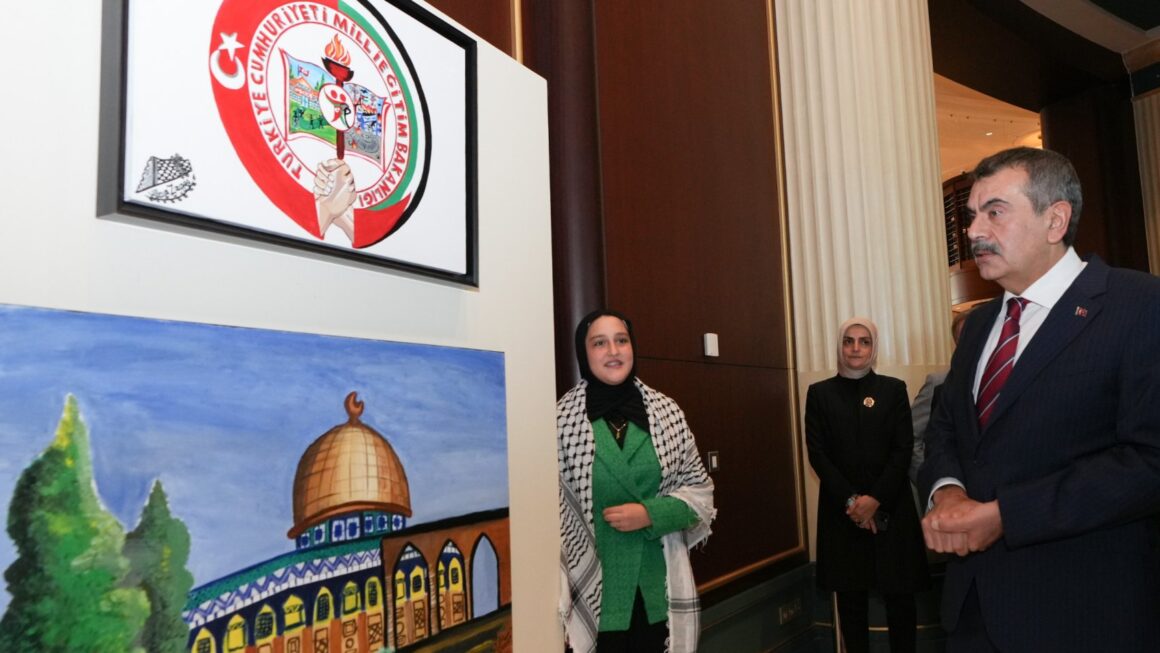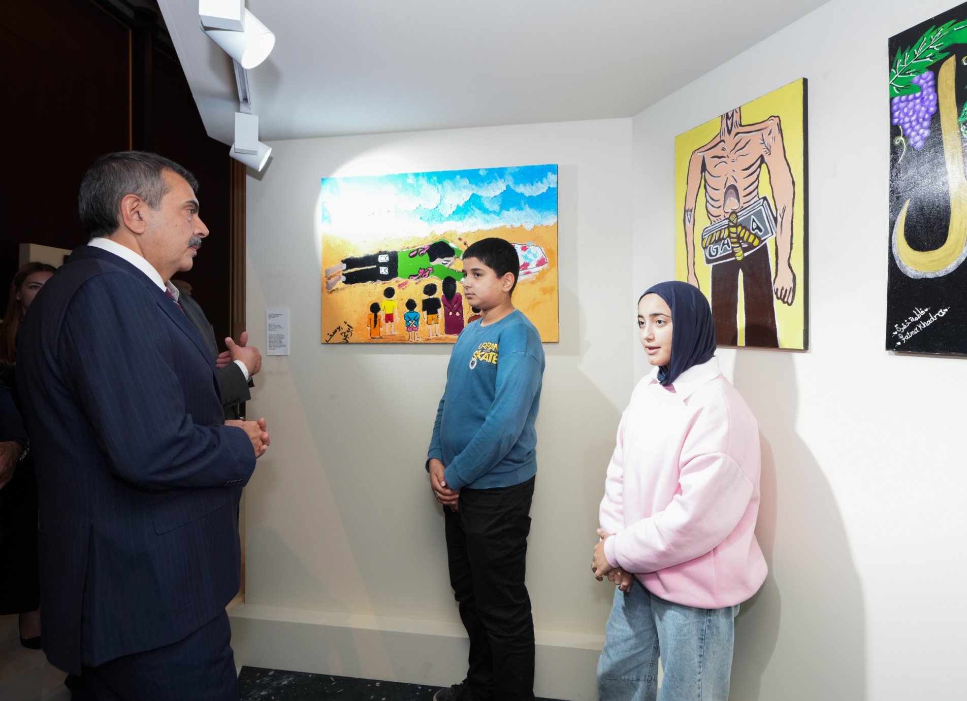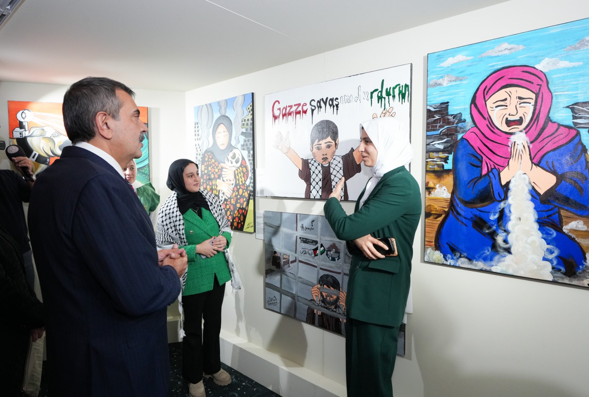 Millî Eğitim Bakanı Yusuf Tekin, Türkiye’ye gelen Filistinli öğrencilerin yaptığı eserlerden oluşan “Umut Acıya Direnirken” adlı resim sergisini ziyaret etti.