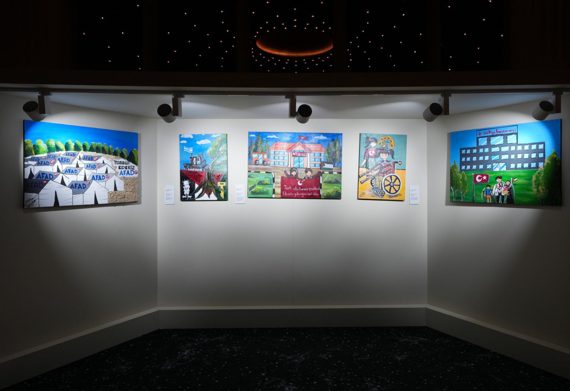 Sergide, Türkiye’de eğitimine devam eden yaklaşık 750 Filistinli öğrenci arasından 13 öğrencinin yaz okulunda yaptığı resimlerin yer aldığını belirten Tekin, öğrencilerin resimlerinde kendi bakış açılarından ülkelerinde yaşanan soykırıma ilişkin duygu ve düşüncelerini anlattıklarını söyledi.