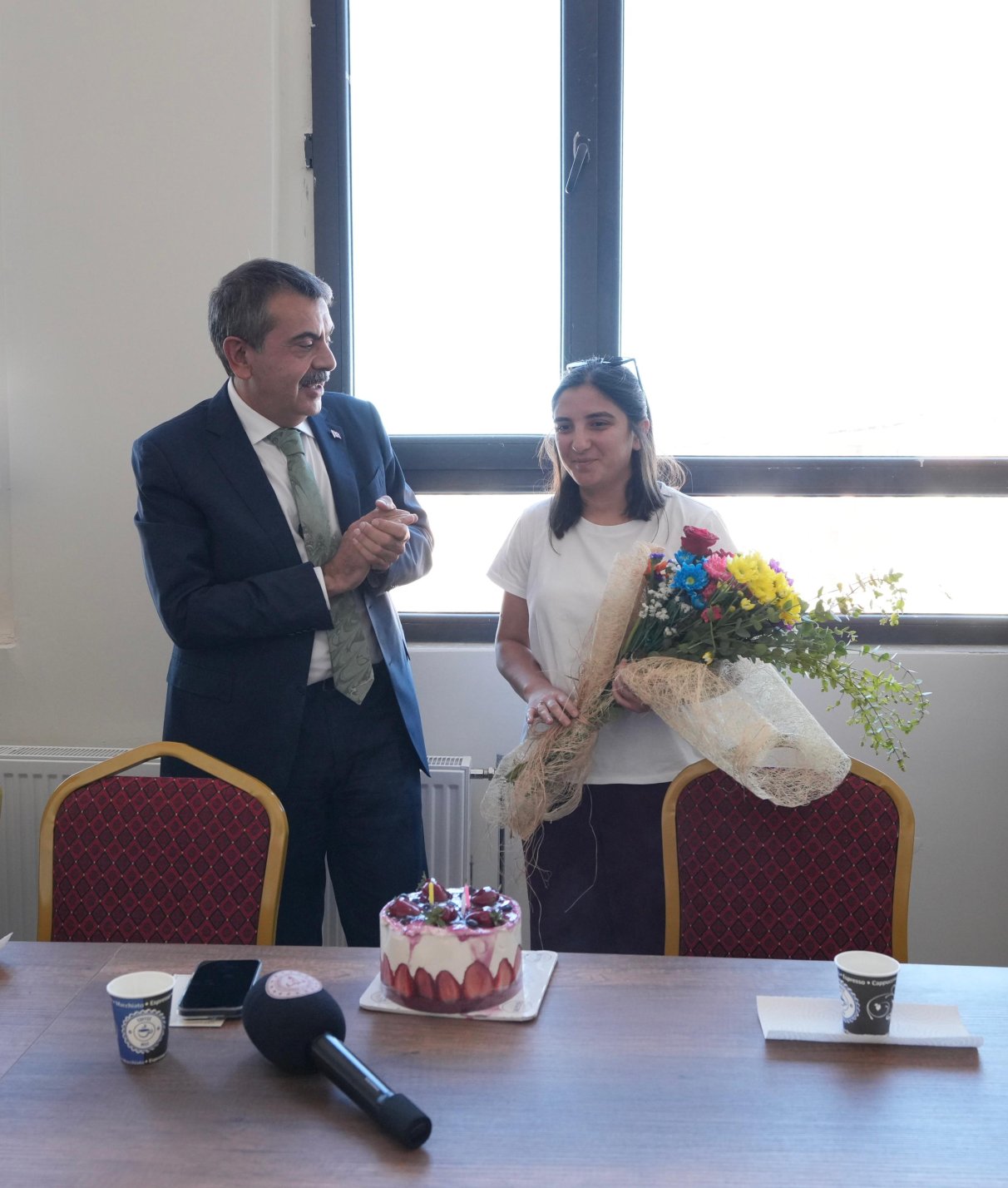 Ziyaret sırasında doğum günü olan beden eğitimi öğretmeni Hilal Parlak’a sürpriz yapan Bakan Tekin, öğretmenin doğum gününü kutlayarak pasta kesti, çiçek ve kalem hediye etti.