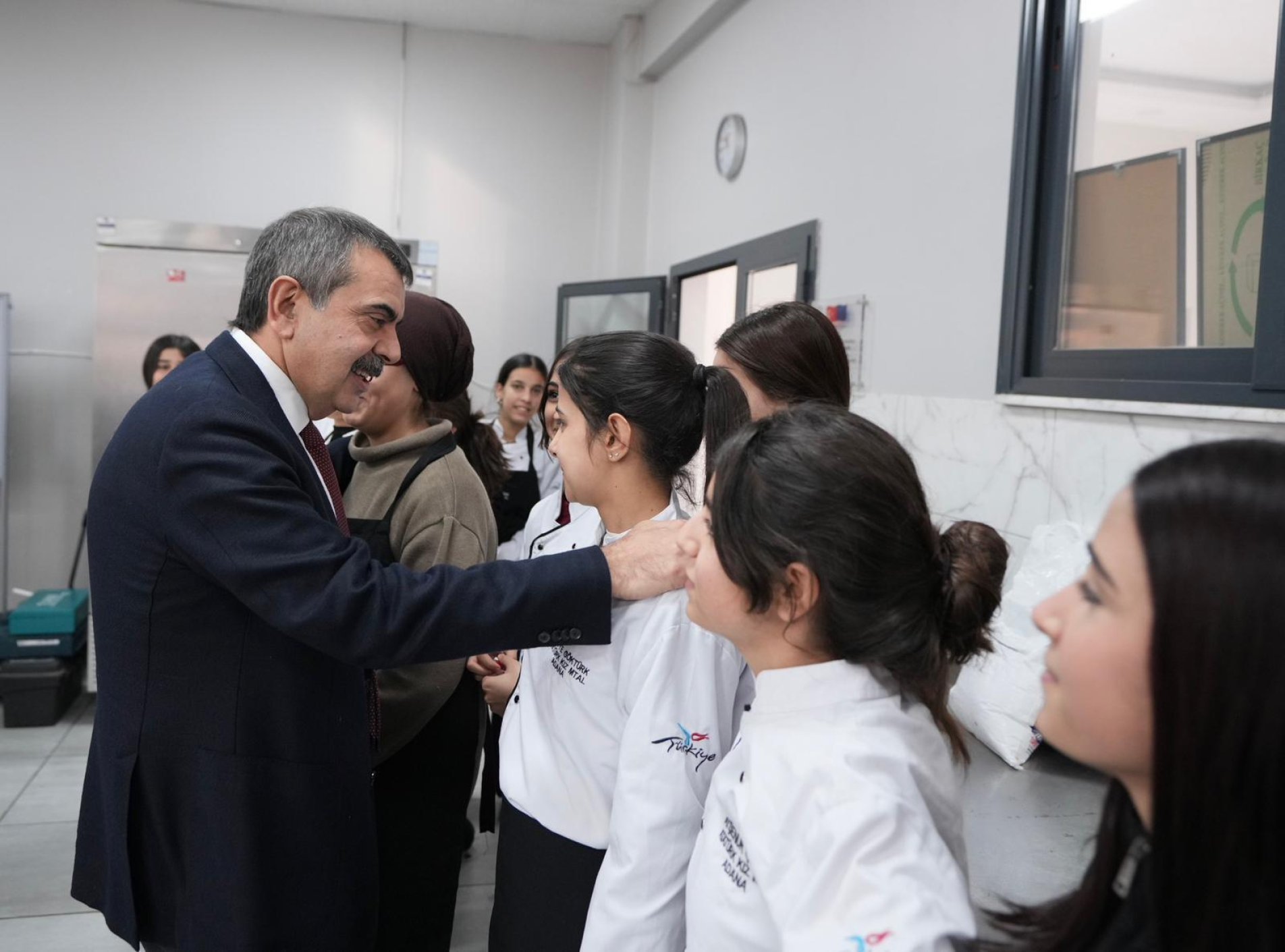 Yiyecek İçecek Hizmetleri alanında eğitim gören öğrencilerin uygulama yaptıkları mutfak atölyesini gezen Bakan Tekin, burada öğretmen ve öğrencilerden çalışmalarıyla ilgili bilgi aldı.