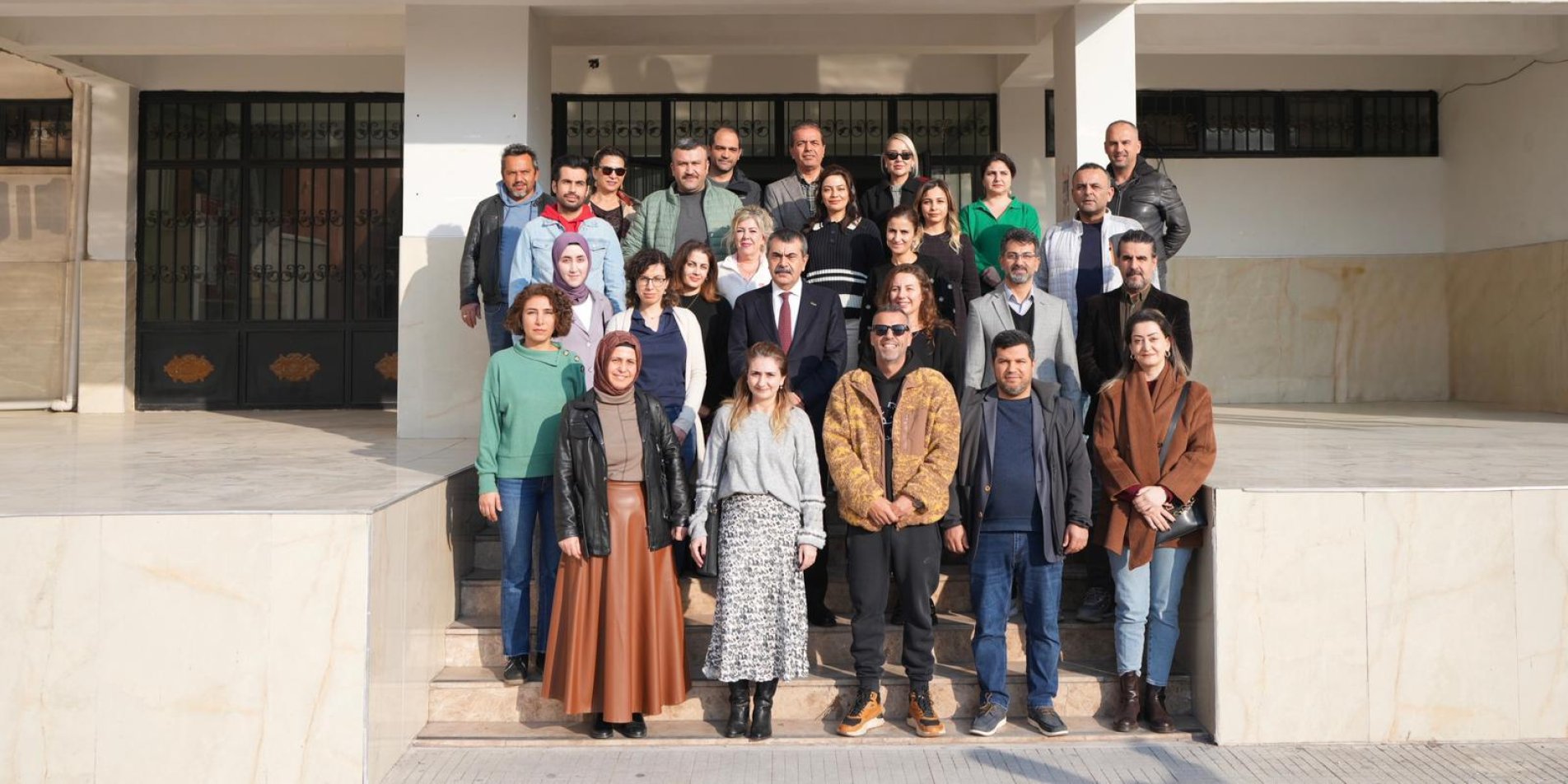 Bakan Tekin, ziyaretinin sonunda okulda görev yapan öğretmenlerle hatıra fotoğrafı çektirdi.
