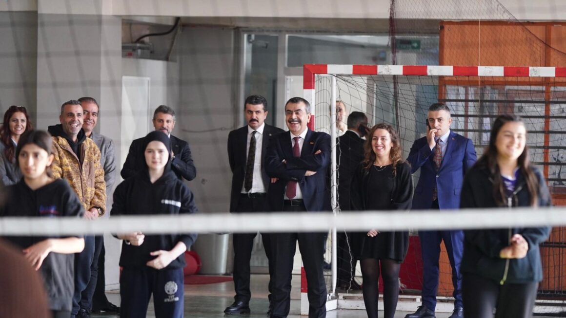 Tekin, daha sonra okulun spor salonunda öğrencilerin voleybol maçını izledi.