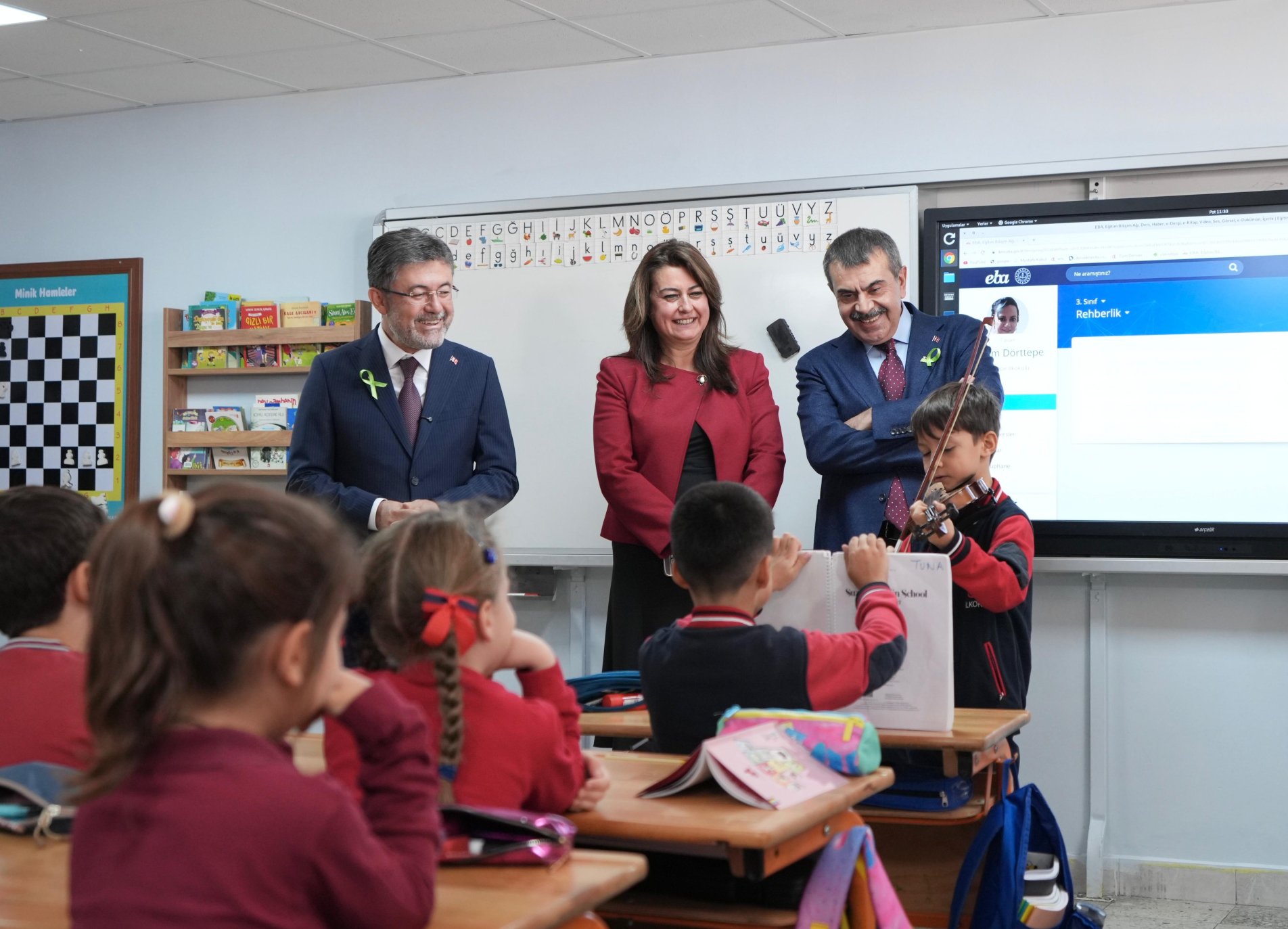Yumaklı ile sınıfları da gezen Tekin, öğrencilerle bir süre sohbet etti. Ziyaret sırasında sınıftaki bir öğrenci keman dinletisi sundu.