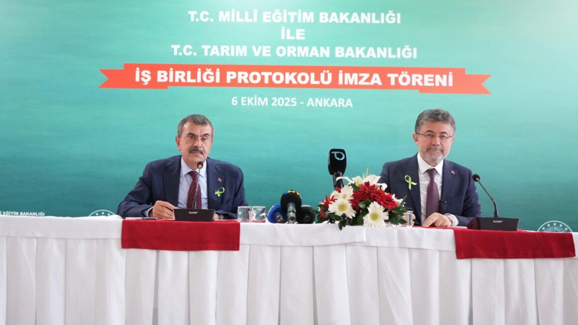 Millî Eğitim Bakanlığı ile Tarım ve Orman Bakanlığı arasında tarım, orman, hayvancılık, su yönetimi, çevre ve gıda sektörlerinde ihtiyaç duyulan nitelikli insan gücünün yetiştirilmesi; öğrencilerde ve toplumda çevre bilinci, tarımsal üretim, su verimliliği, gıda güvenliği, hayvan sağlığı ve sürdürülebilir kalkınma konularında farkındalık oluşturulmasını hedefleyen iş birliği “çatı protokolü” imzalandı.